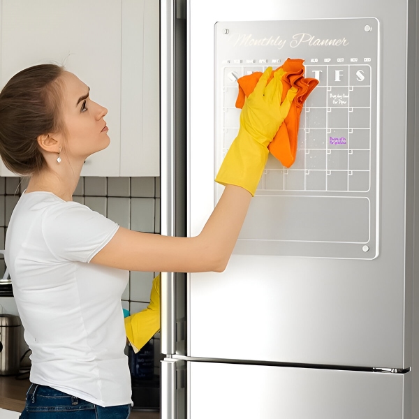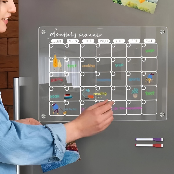 A papír alapú naptárak egy hónap után lejárnak, és egyenesen a kukában végzik. A tiszta akril felület teljesen tisztára törölhető másodpercek alatt a mellékelt kendővel – nincs szellemkép, nincs folt, nincs maradék. A felület karcálló és foltmentes, így kristálytiszta marad több száz letörlés után is.