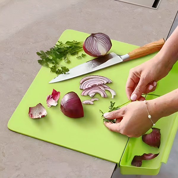 Tartsa rendben és hatékonyan konyháját! 🍅🍴 Ennek a vágódeszkának a levehető tartálya felfogja az összes apróra vágott hozzávalót, így az ételek előkészítése gyerekjáték lesz, és takarítási időt spórol meg. 🧽✨ Mondj búcsút a pulton lévő rendetlenségnek!