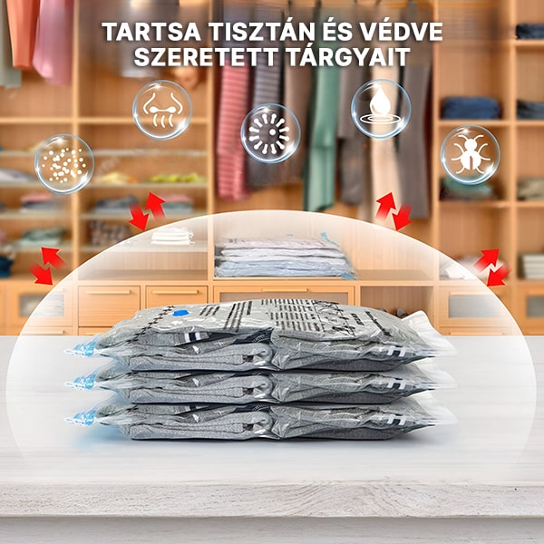 Nincs elég tárolóhely? Takarítson meg akár 80% helyet vákuumos tárolózsákjainkkal! Egyszerűen csomagolja be – zárja le – és porszívózza ki a levegőt, hogy csökkentse a terjedelmes tárgyak, mint a ruhák, takarók és ágyneműk méretét. Több hely, kevesebb rend!