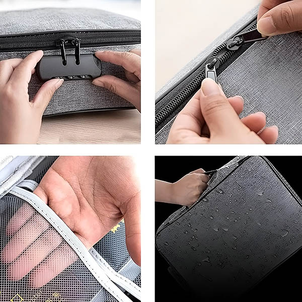 Aggódik fontos dokumentumai és értékei biztonsága miatt? Ez a vízálló táska biztonságos kódzárral van ellátva, így biztosítva, hogy dokumentumai, pénze és ékszerei mások számára hozzáférhetetlenek maradjanak.
